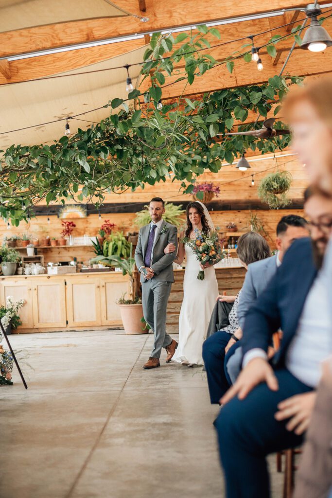 The ceremony space at The Arnold House looked like a garden brought indoors. Wooden ceilings and beams we hung with ferns, potted plants, and Edison bulbs created a cozy, warm vibe. Vibrant floral arrangements in yellows, peaches, blues, and whites lined the aisle. Wooden folding chairs added a rustic touch, while string lights glowed overhead.