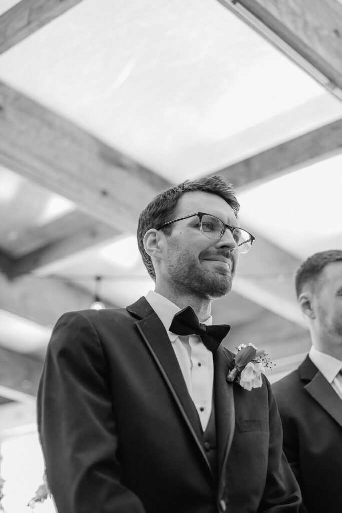 Meanwhile, Justin and his groomsmen got ready nearby. He wore a black tuxedo with satin lapels, a bow tie, and a crisp white shirt. His boutonnière echoed Julie’s bouquet with blue and white blooms. A brown leather-strapped watch gave his look a personal touch. The groomsmen matched in black suits and ties, keeping the group polished and timeless.