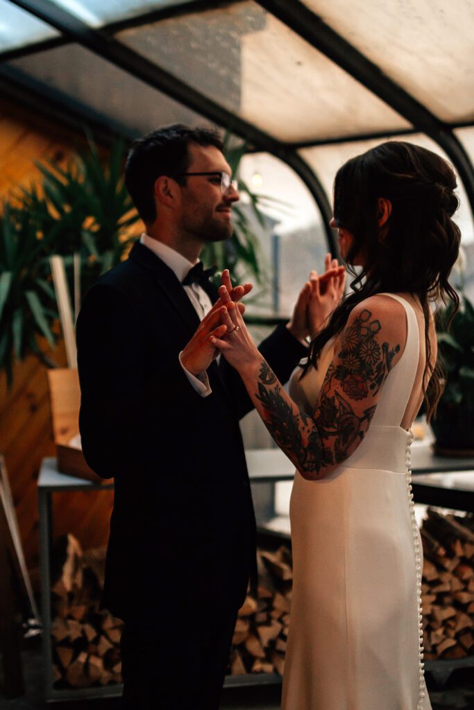 Afterward, we helped organize portraits with the wedding party, family, and close friends. The lush greenhouse space, with its mix of wood, greenery, and string lights, made every photo feel timeless and warm.