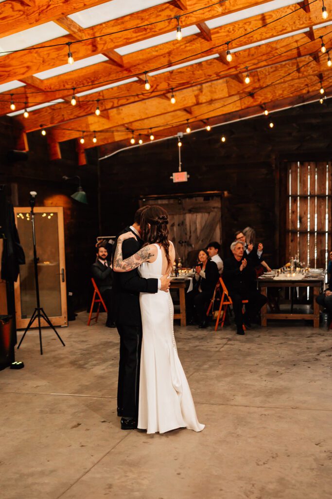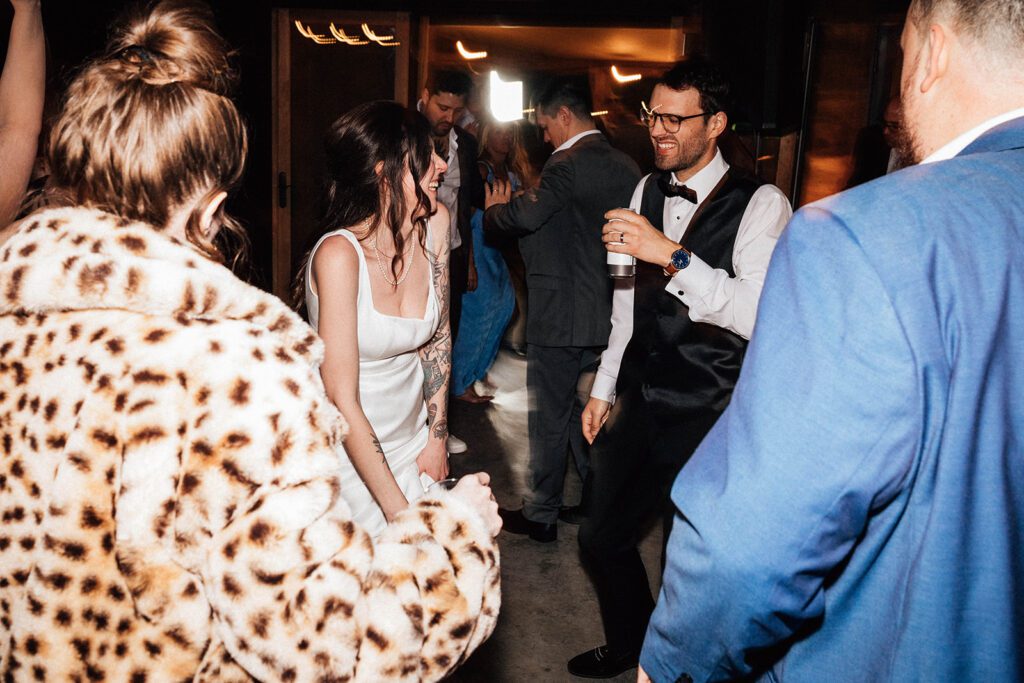 Later that night, Julie layered on a black leather jacket painted with floral details. It was an edgy twist that added even more personality to her bridal look. It was a striking contrast to her minimalist gown and fit right in with the lively, cozy energy of the night.