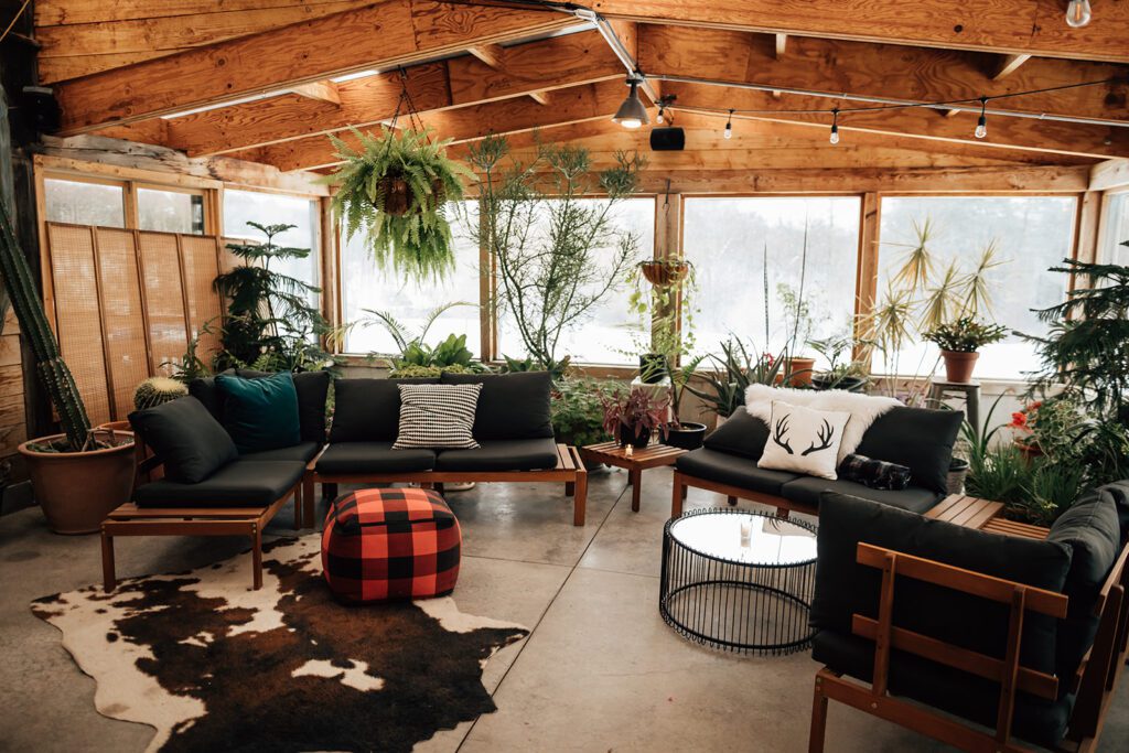 Inside the cozy greenhouse lounge, we styled the space to feel cozy and inviting. Plaid poufs, modern seating, cowhide rugs, and plenty of greenery, creating a retreat-like atmosphere.